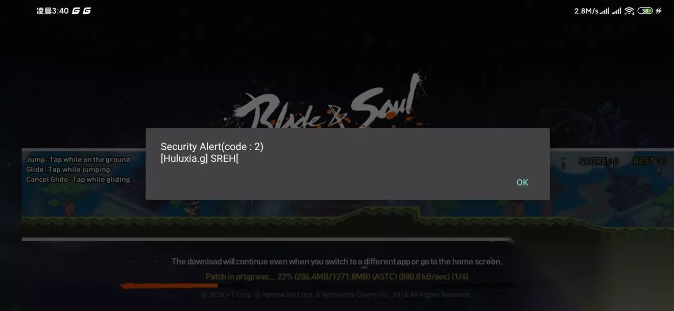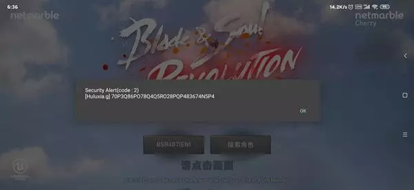 其中最容易被玩家问到的一种报错形式那就是提示Secruity Alert(code:2)之后再附上了另外一些文本。 比如上图这种就是触发了这种异常的典型,而导致这种异常的原因其实已经在其中给出了关键的提示了。 已上图为例,在报错提示的下方给出了{Huluxia},这就是指检测到玩家手机中安装了葫芦侠,与本作有冲突。