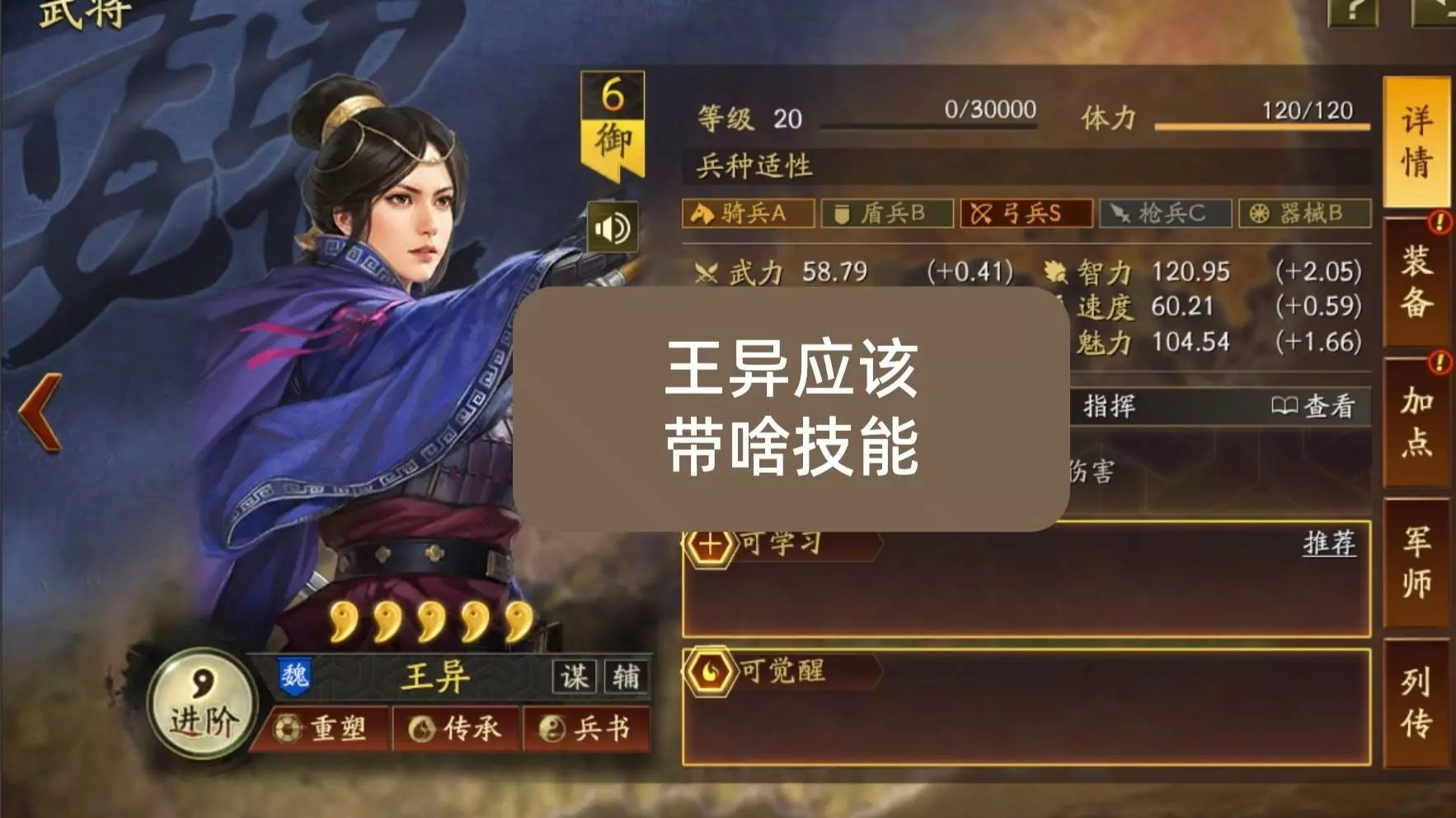 王异正常需要叠面板,所以文武双全是王异最天配的技能。哪怕A兵科走骑兵的王异,在S赛季带着文武双全也有机会登场。