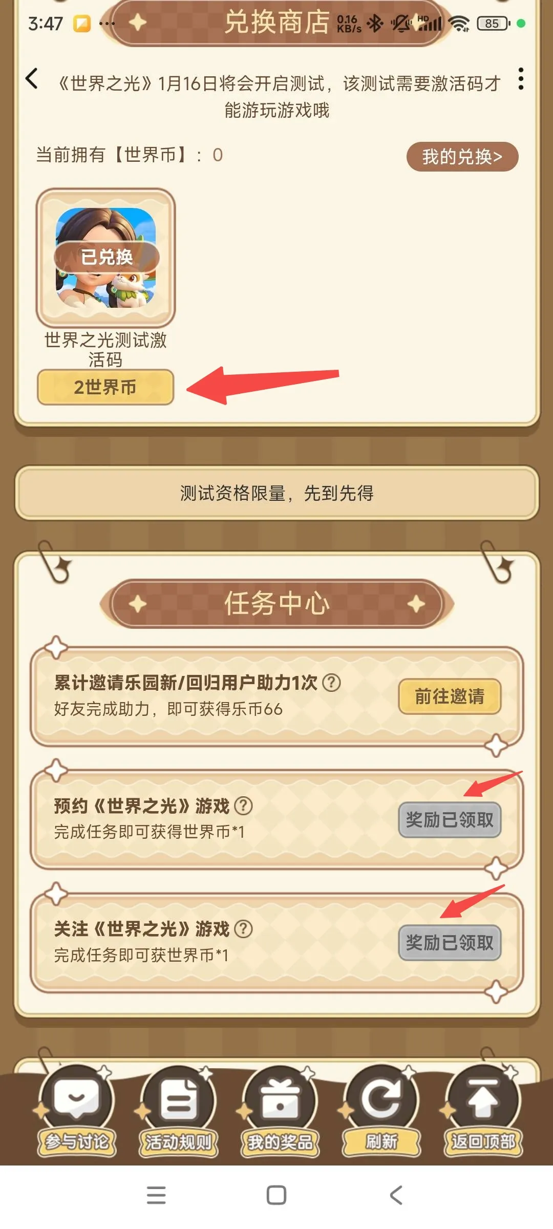 2.完成任务领取世界币并进行兑换