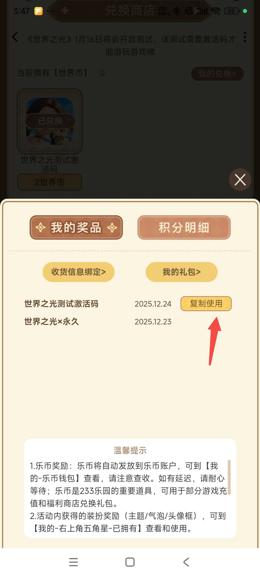 4.兑换奖品后,点击复制使用