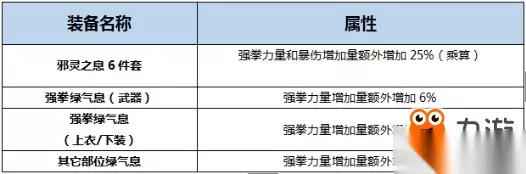 1、BUFF介绍 强拳再次改版,力量大幅削减。堆完美BUFF收益比之前差了很多。穿邪灵6,30级强拳,为598力量, 68%暴伤。而完美BUFF约700力量,但是要付出3保宝珠,2个白金称号 堆起来收益极低,所以并不建议新手弄完美BUFF套。 2、换装搭配思路 穿戴邪灵之息6件套的情况下堆满等级,根据能力(宝珠,白金,宠物光环等)将溢出的等级装备替换为“E3强拳绿气息散件”。 3、异界套装/异界散件(绿气息)属性介绍