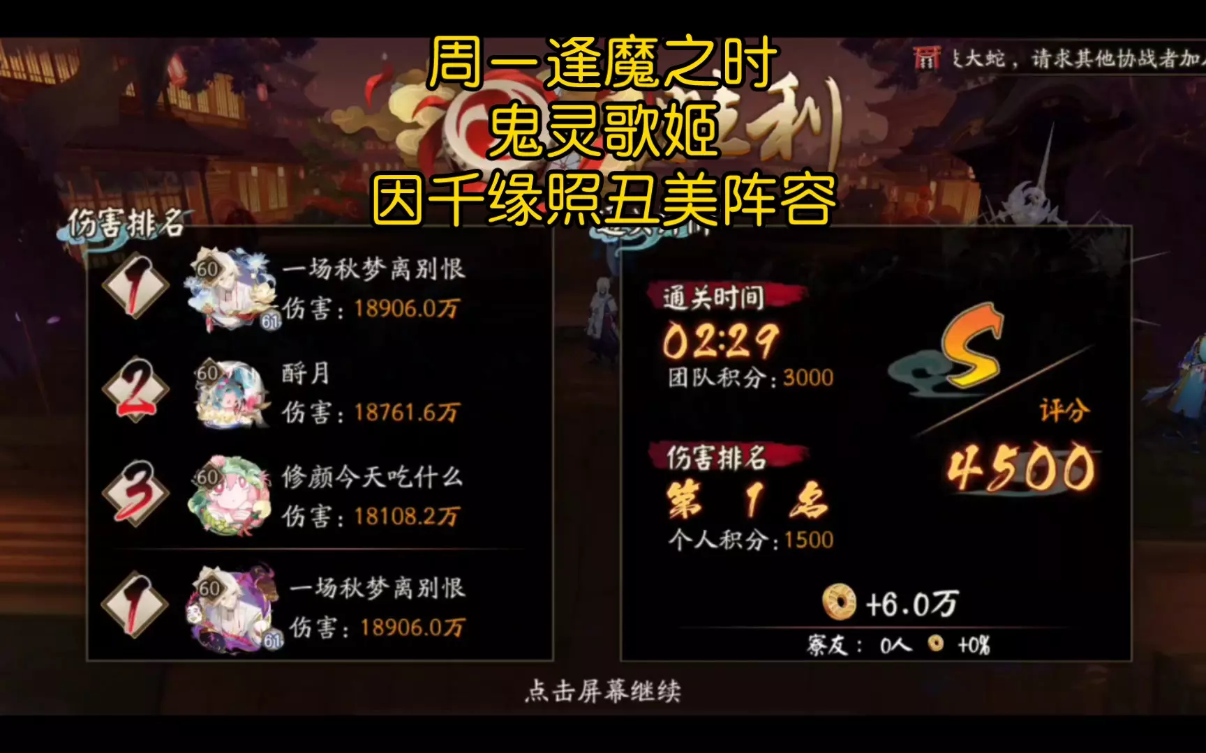 【阴阳师】周一逢魔之时,鬼灵歌姬,因千缘照丑美阵容,4500评分