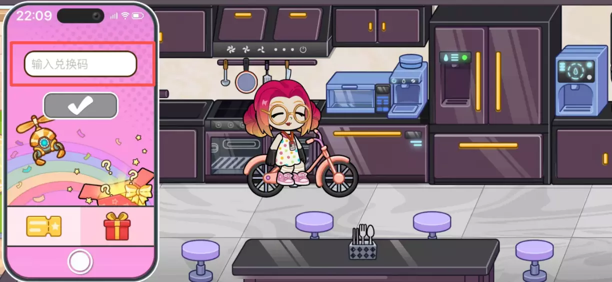 A:进入游戏任意房间---点击左下角手机图标---点击设置(齿轮图标)---点击兑换码---在兑换框内输入兑换码---点击兑换按钮兑换---兑换成功,获得礼包