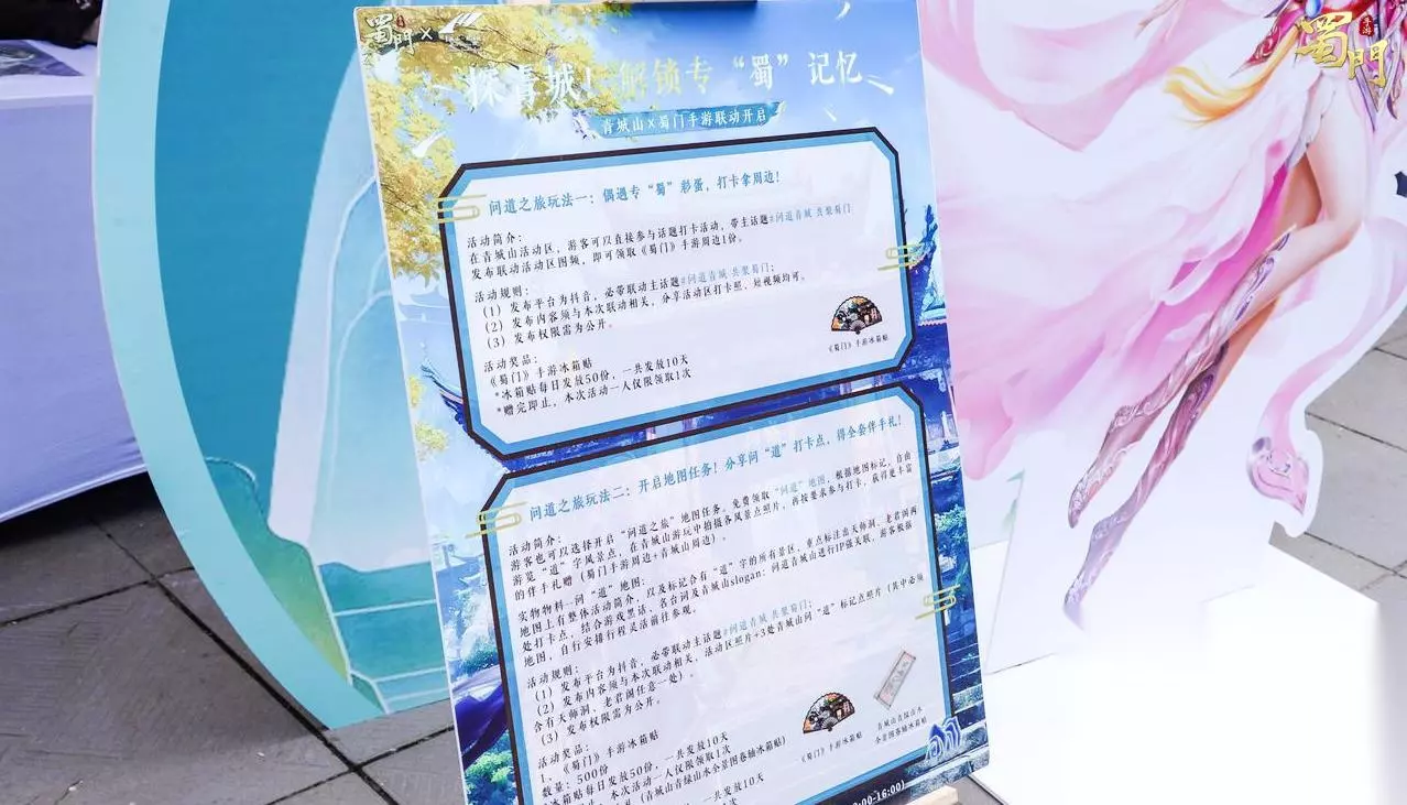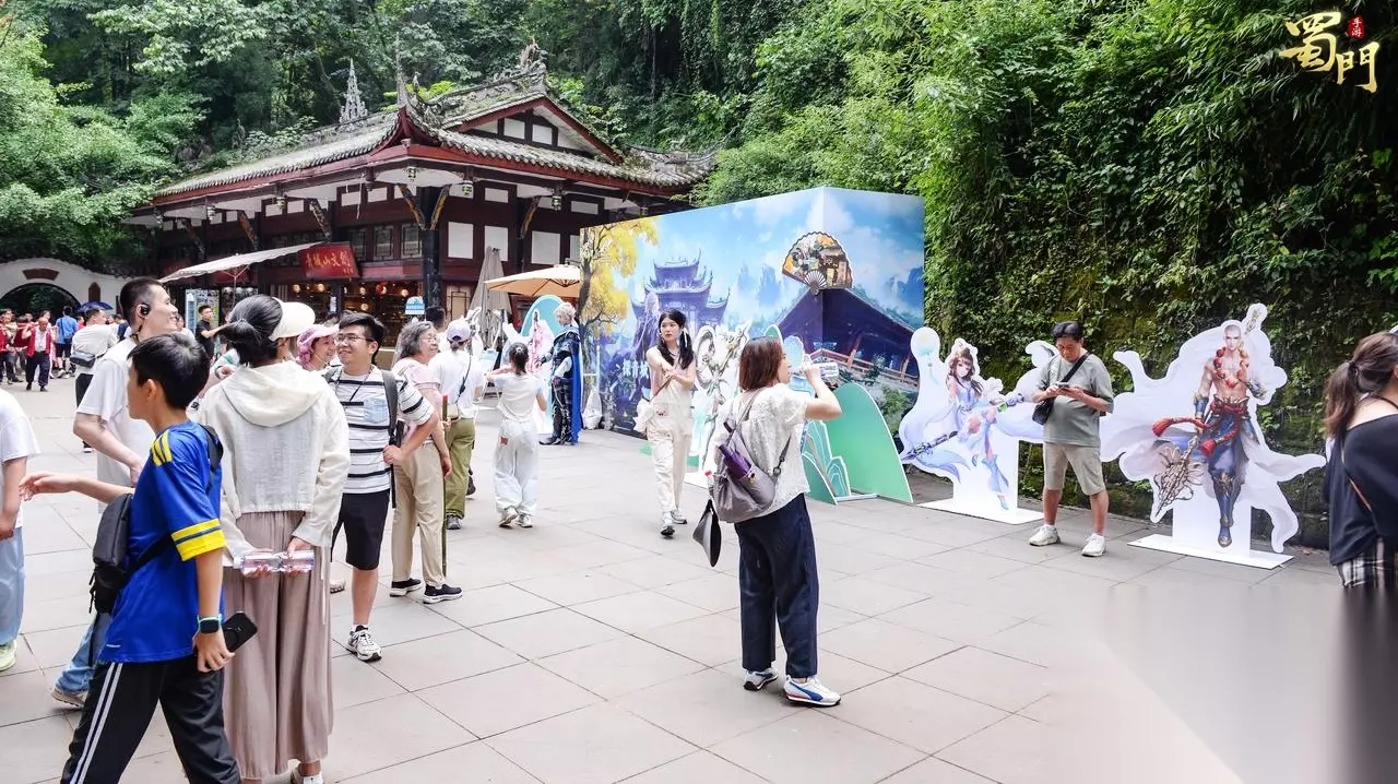 步入活动核心区域,瞬间便能感受到蜀门的氛围。精心搭建的活动展台简约大气,灰石板地面呼应着青城山的厚重历史。 在此间林立着巨幅游戏角色立牌,彩衣翩跹的侠客以惊艳之姿跃然而出,后方,苍翠山林掩映着飞檐古建,蜿蜒阶梯上游人如织,自然山水与游戏幻想在此刻奇妙共生。
