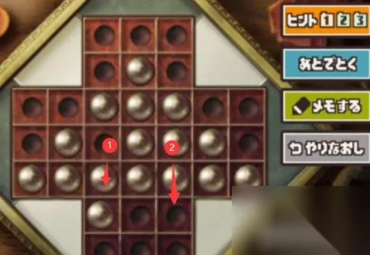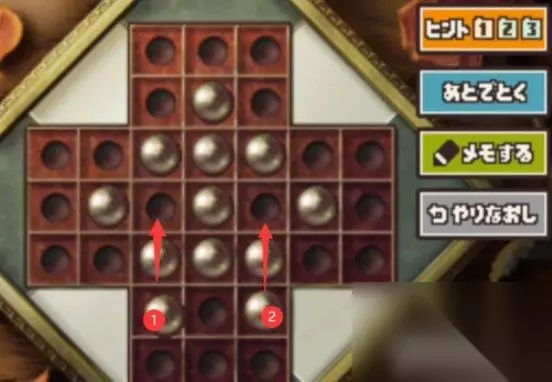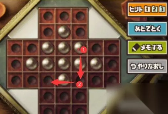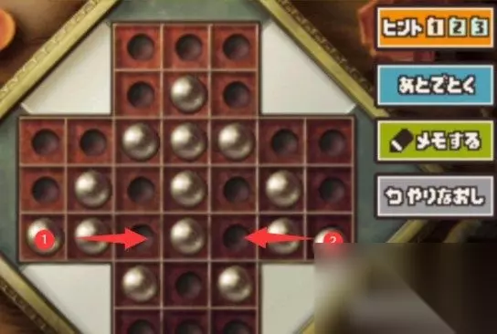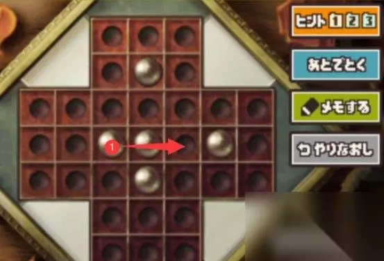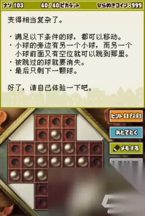 雷顿教授与恶魔之箱谜题103攻略 关卡:谜题103 要求: ·满足以下条件的球,都可以移动。 ·小球的旁边有另一个小球,而另一个小球前面又有空位就可以跳到那里。 ·被跳过的球就要消失。 ·最后只剩下一颗球。