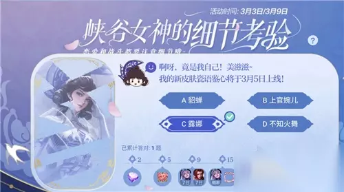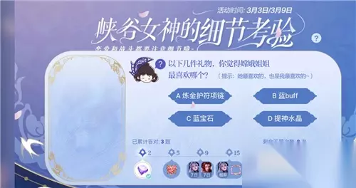 t15_2-t15_1:10.0 标签: 嫦娥 王者荣耀嫦娥姐姐最喜欢的礼物是什么?游戏在近期开展了全新的峡谷女神的细节考验,玩家需要回答对关于峡谷女神的问题,才能获得最终的奖励,嫦娥姐姐最喜欢哪个礼物这是细节考验中的第四题,很多玩家不太清楚应该怎么选择,下面小编就为大家带来细节考验的答案大全。