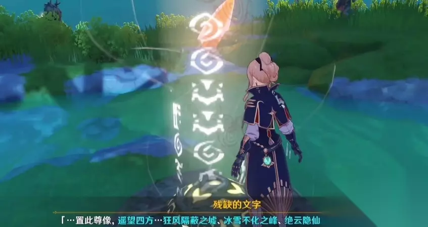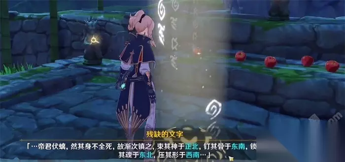 8、在轻策庄的西南方向的山顶上,可以找到一个光柱,与“残缺的文字”对话,在根据提示启动相应位置的五个石像。