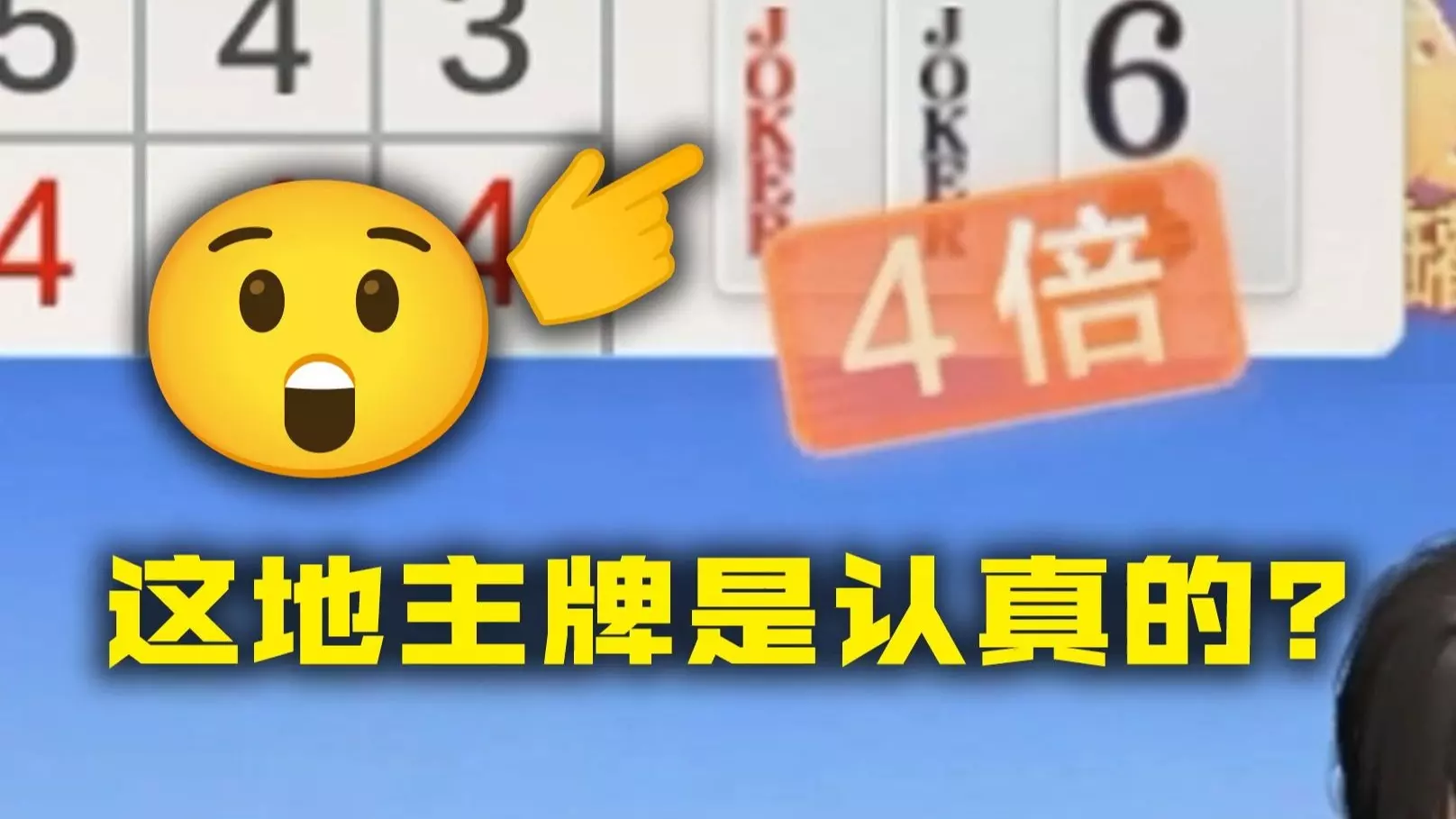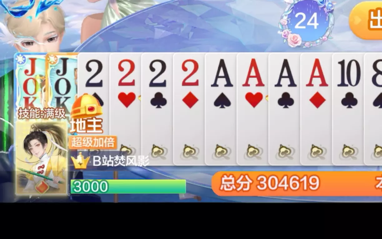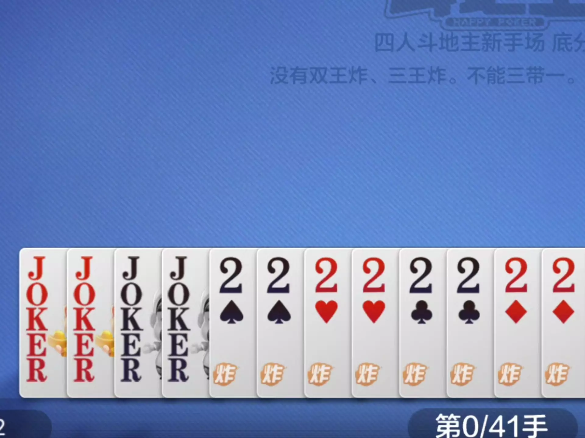 头一次拿到4个王8个2的牌,点1分是因为四人叫分时基本上点了分就是地主。上帝视角看这是天牌,不过实战不知道所以没点超级加倍。打起来的时候其实挺怂的,一直怕A过不…
