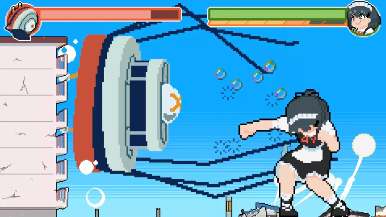 安静、平和的城市街道,和往常一样......突然,一个巨大的怪物出现了!城镇被怪物破坏。混乱中,一个笨拙的女仆突然变得巨大!?用你庞大的身体攻击敌人,拯救城市!女仆可能会一路上毁坏几栋建筑,但这也是没办法的事!这是一款2D游戏,一个巨型女仆在击败敌人的同时摧毁建筑物。摧毁建筑物会积攒能量条,让你能释放更强力的攻击。摧毁一切!