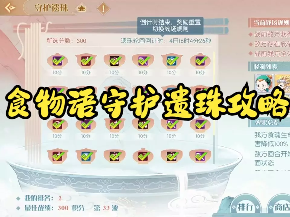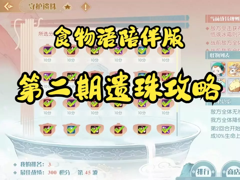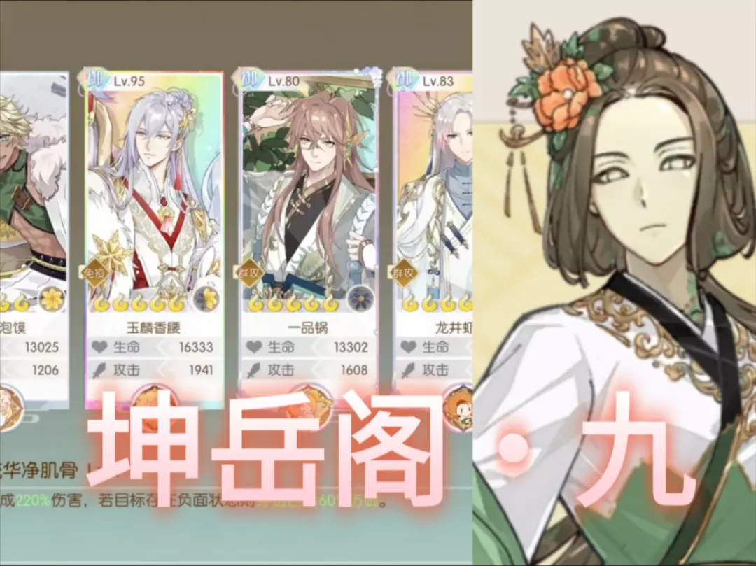 这是《食物语》坤岳阁九层的通关攻略,推荐出战食魂为满花80级羊肉泡馍、零花80级臭鳜鱼、4花怀抱鲤、4花青精饭,膳具无特殊要求,靠加伤和刷新技能CD来通关。