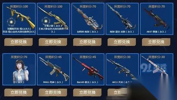 积分兑换 可兑换奖励 100积分:觉醒版烈龙-悦心(永久)+烈龙-悦心金色光效兑换券(永久)、王者之影(永久)王者之影金色光效兑换券(永久) 70积分:加特林-炼狱(永久)、炼狱-星空 皮肤(永久)、AK47-黑鲨(永久)、空(永久) 45积分:M4A1-死神(永久)、Barrett-极光(永久) 30积分:AK12-天启(永久)、QBZ03-金色蔷薇(永久)