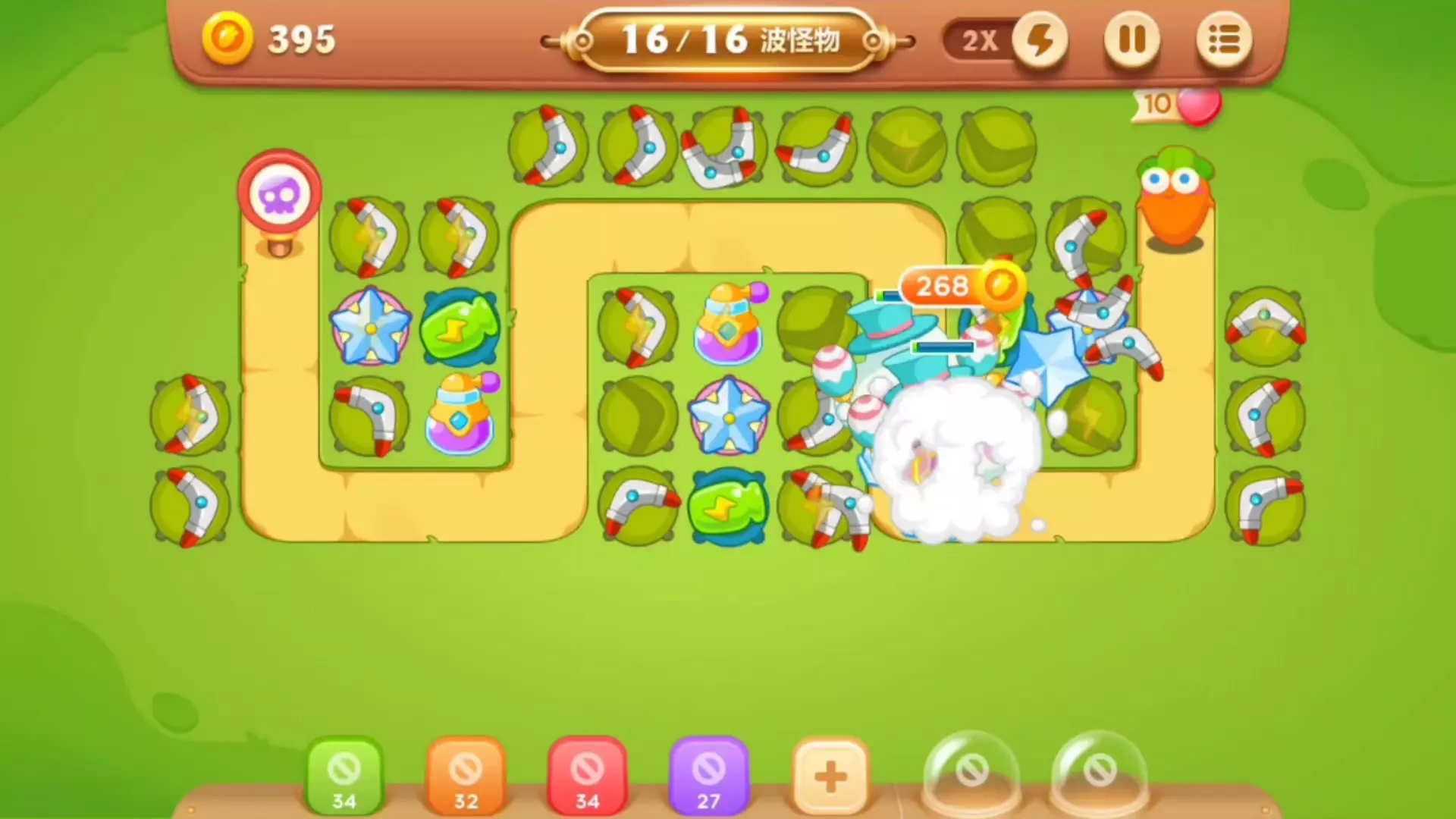 在保卫萝卜4的阿波道长第13关中,主要使用了多重箭炮台进行输出,同时辅助以魔法球和绿瓶子炮台,利用多重箭炮台打怪的同时,也集中火力打掉障碍物,以尽快收集资金,随…