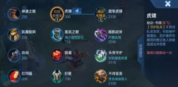 王者荣耀张飞专属装备 虎啸 被动-专精(张飞) [守护机关]不再对队友生效,但自身护盾增加,且护盾存在期间对附近敌人持续造成法术伤害 每局只能购买一次