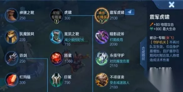 震军虎啸 +80物理攻击 +800最大生命 被动-专精(张飞) [守护机关]不再对队友生效,但自身护盾增加,且护盾存在期间对附近敌人持续造成法术伤害 被动-力量进阶 当额外物理攻击达到200时,获得150点物理穿透 每局只能购买一次