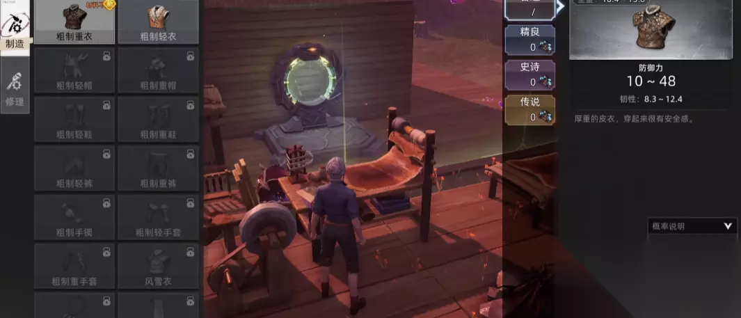 二、武器装备制作在这个世界生存,危险重重,要面临各种外部的威胁,比如野兽,恶劣的天气环境等,因此对新手而言,装备与武器就是前期生存的保障,一开始一定要尽快利用木材,石头,去将石斧和石矛制作出来,这两个装备不仅能加快采集材料的进度和效率,也是一种不错的武器,虽然说攻击力不是很高,但是应对业主,野狼之类的小型生物是足够的,之后等累计更多材料后,再根据个人战斗风格,去打造更加强大的武器,例如近战的长剑,远距离的弓箭等。