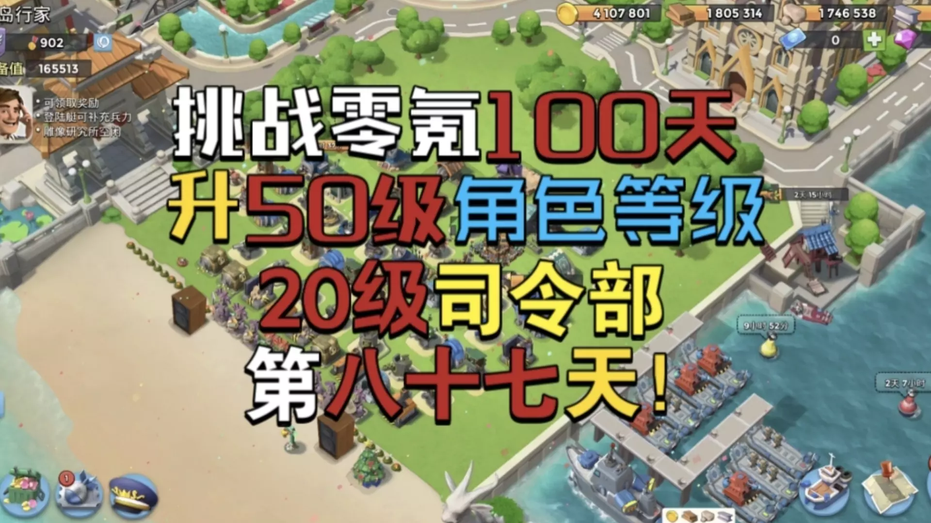 这是《海岛奇兵》零氪100天升级挑战的第99天内容,展示了基地建筑升级情况,包括升级需12小时的八级巨型加农炮,还呈现了商人商店、四月签到奖励,同时进行烟雾弹研究,朝着50级角色等级、20级司令部的目标推进。