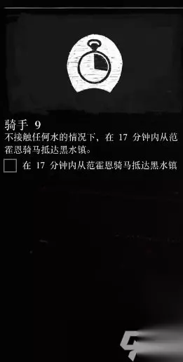 点此查看攻略合集>>>《荒野大镖客2》生存大师挑战攻略大全 生存大师挑战怎么做 骑手挑战9: 目标: 不接触任何水的情况下,在17分钟内从范霍恩骑马抵达黑水镇。