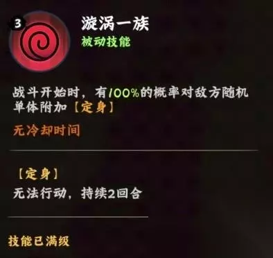 一旦敌人陷入这种困境,就彻底失去了行动能力,与传统常见的束缚效果不同的是,这种定身状态不会因为受到攻击而轻易解除,这一特性赋予了它极大的战术优势,使得敌人无法通过常规手段摆脱控制,在这两个回合内,其他队员可以毫无干扰地进行攻击、施展技能或者调整站位,从而打出一套连贯且高效的组合输出。 核心被动技能漩涡一族属于百分百触发的开场控制,如果说主动技能已经足够亮眼,那么她的被动技能漩涡一族则是在每场战斗一开始,就有100%的几率对敌方随机单位施加定身效果,同样持续两个回合,如此高的触发几率几乎保证了在每一场战斗中,敌方必定有一个随机角色会被牢牢锁定在原地这,一特性为玩家提供了丰富的战术选择空间,玩家可以精准地控住对方的核心输出或关键辅助角色,一旦成功限制住这些重要目标,本场战斗的胜率将会得到提升。