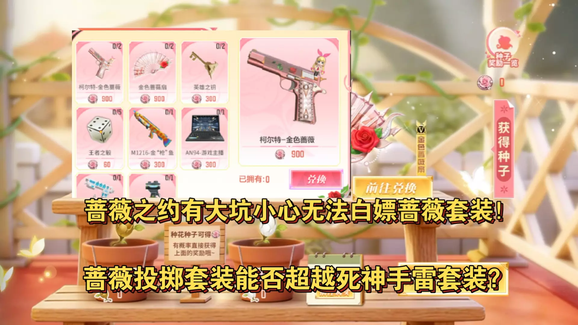 这是蔷薇之约活动的速通攻略,可通过在种子商店交易金色、银色种子获取蔷薇币,还能找金色种子价格低的好友串门购买,以此攒资源白嫖金色蔷薇套装,活动还有机会获得金色蔷薇副武器和近战道具。