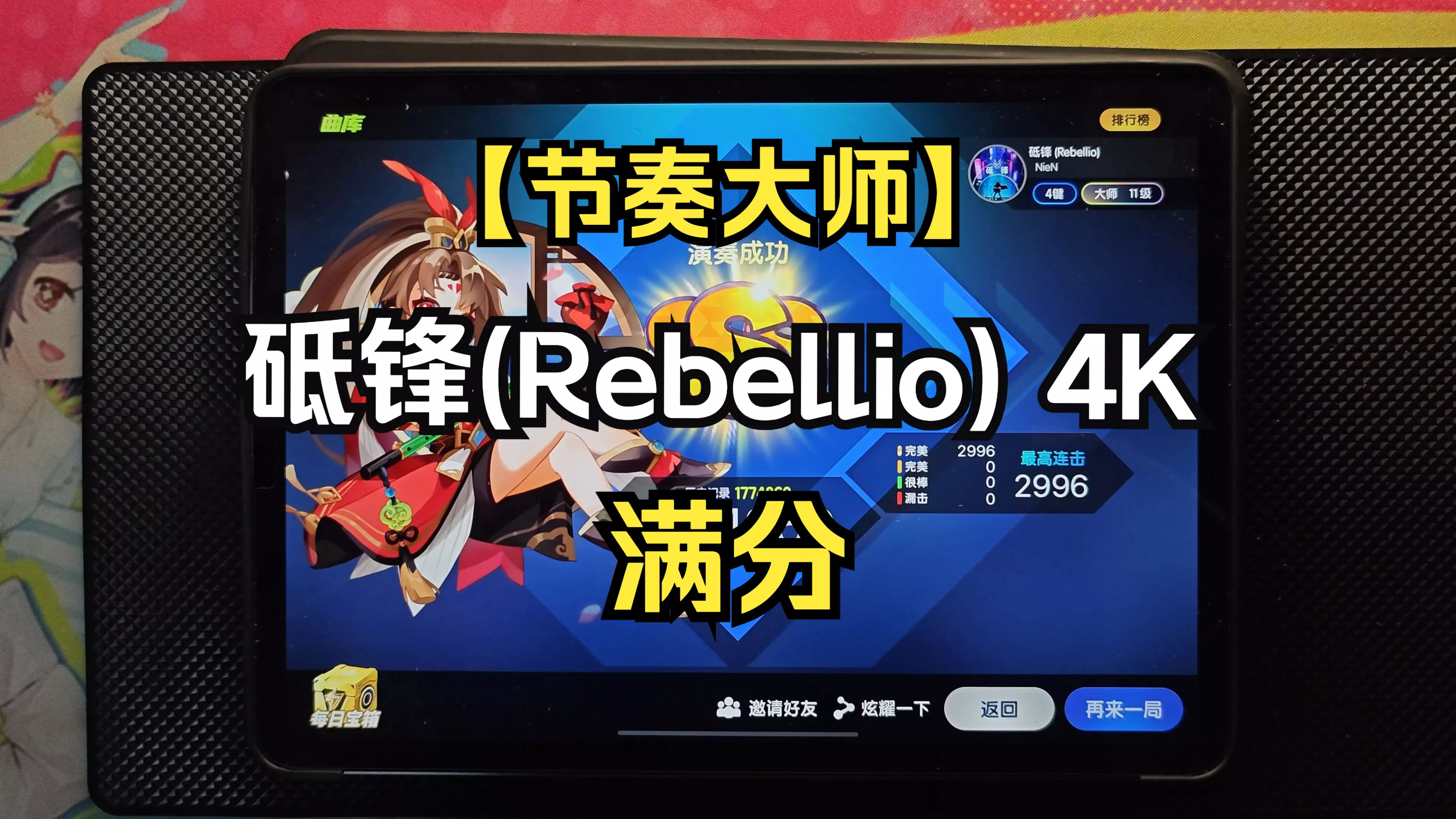 这是节奏大师中谱师@Alwaysover制作的《天元枢机》4K谱面,平均难度Lv.13.8,考察切换与爆发能力,玩家使用6命命中183的角色雫完成了该谱面的满分通关,谱面入口在大师制造。
