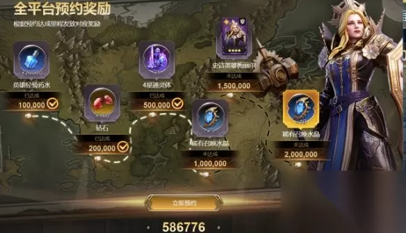 4、达成全网200万预约日标,累计可得史诗英雄·梅丽尔、稀有召唤水晶*15、4星通灵体*1、钻石*100和英雄经验药水*20000丰厚奖励。
