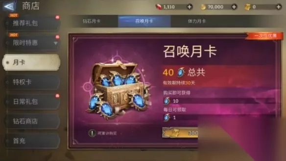 2、召唤月卡:首次购买仅需30元,购买时直接得到10抽,30天连续登录共可获得40抽,折合0.75/蓝抽。