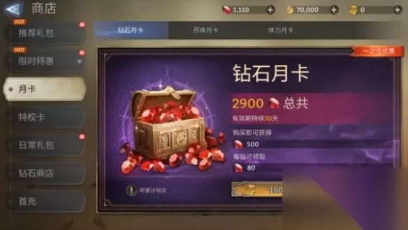 3、钻石月卡:首期售价18元,购买时直接得到500钻,30天连续登录共可获得2900钻(折33抽),折合1.83/蓝抽