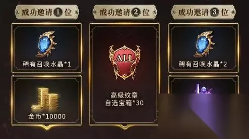 5、玩家成功邀请指定数量的好友预约游戏,可额外获得稀有召唤水晶、高级纹章自选宝箱、4星通灵体及金币等奖励。