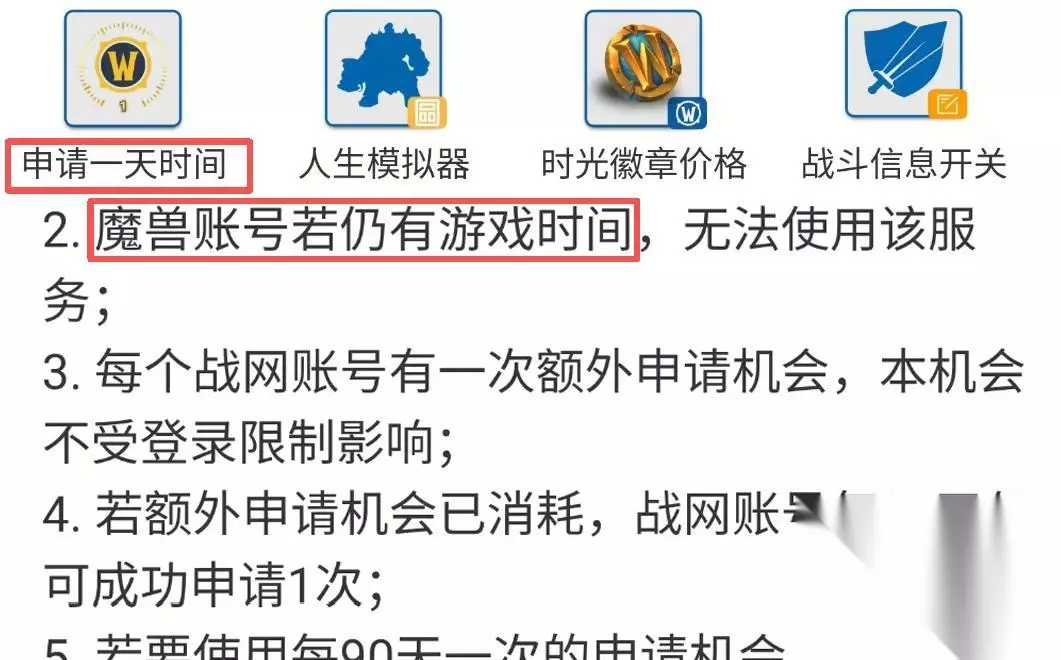 二、免费一天游戏时长 领取三天游戏时长的限制较多,对玩家AFK时间要求也更长一些,如果没有达到这个要求,可以选择领取一天游戏时长。 具体方法是前往“魔兽世界服务中心”,点击服务中心,在实用功能内找到申请一天时间。 申请一天时间的要求只有三个: 第一个是账号没有游戏时间; 第二个是90天内没有申请过; 第三个是过去7天没有登陆过游戏。