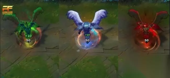 W技能方面 W技能分有两段特效,命中目标时,绝代智将的特效是一颗墨绿色的光球,并且带有底纹图,二段特效回来的是一直黑色带有绿尾光的鸟。北领前线的特效是一颗冰系蓝色光球,二段特效回来的是一只白色的鸟。而海贼参谋的则是和原画类似的红色光球,二段特效回来的是一只黑色的带红尾光的鸟。