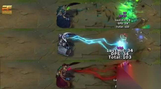R技能方面 R技能变身之后,三款皮肤都有各自的特效,并且还会有二段伤害,这里没给截出来,各位可以看看视频,视频演示中会清晰的展现。绝代智将在R技能方面不如北领前线,北领前线的R技能在释放的时候,类似闪电的效果很霸气!
