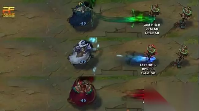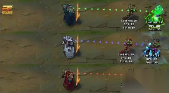 E技能方面 E技能同样是有两段特效。绝代智将释放E技能时,是一团墨绿色的光束,命中后是绿色效果。北领前线释放E技能时,是一团蓝色光束,命中之后是冰霜效果。海贼参谋释放E技能时,是一团红色光束,命中之后是红色效果。