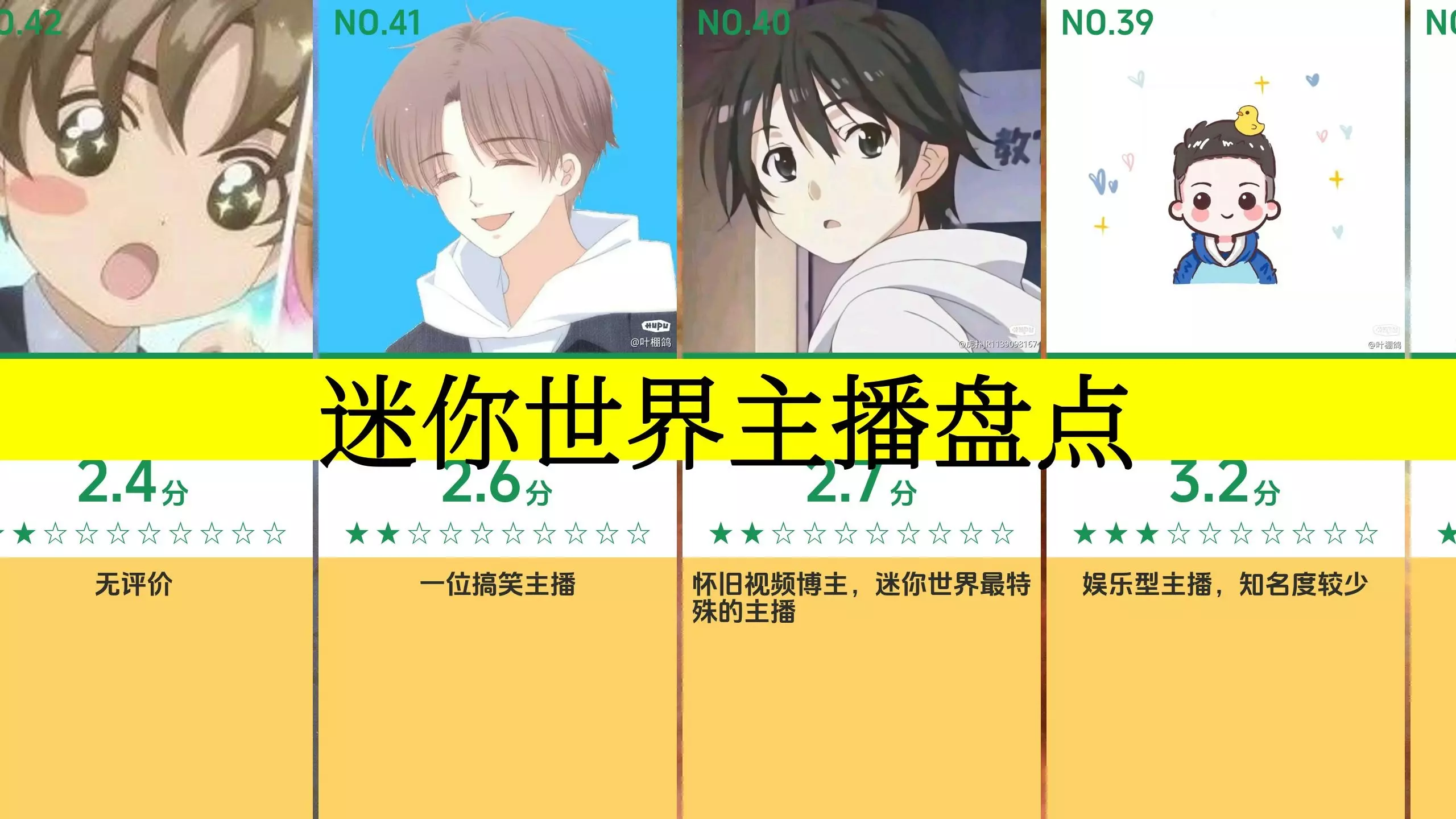 热评(虎扑评分,迷你世界主播):"刘半仙^二狗子^墨渊^画小乐^江叔^墨墨鸽鸽^小乾^羊纸^兔八哥^酒肉美人"