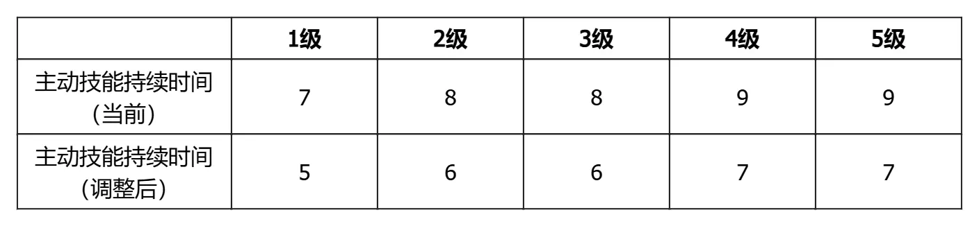 爆破模式下,主动技能持续时间由7s调整为5s,成长后由10s调整为8s;主动技能对满血敌人透视时长由1.35s调整为1.85s