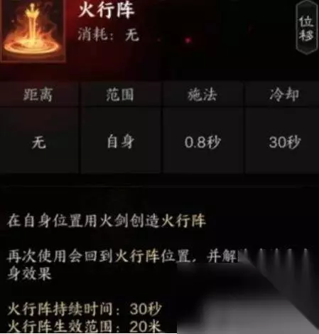 6、火行阵:位移技能,在当前位置创造火行阵,再次使用可回到火星阵位置
