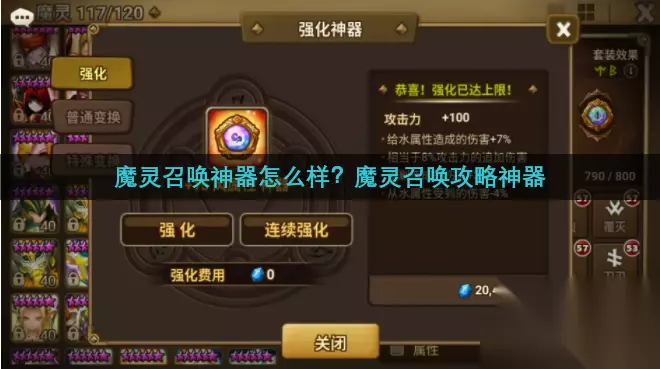 1.魔灵召唤神器怎么样? 基础属性,在强化至满级15级后单个神器可提供100防御力/1500点体力/100点攻击力的数值提升,虽然不如一块符文带来的面板提升大,但在符文更替升级速度变慢的中后期,这些稳定不看脸的属性提升也非常珍贵。由于这一特点,即便还没有刷到非常合适的神器也推荐先根据魔灵需要的属性安装主词条契合的神器。例如一块风属性主词条为攻击力但副词条一般的神器,就可以先给风奥风丑等魔灵用于提升面板(攻击力+100),待日后刷到主副词条都合适的神器后再做替换。这块神器并不非常适合风奥,但可以先用来提升面板,进入每天自动刷符文的玩家一定不要吝啬蓝水,无论是符文还是神器都要强化到+15,不要小看主词条带来的面板提升。