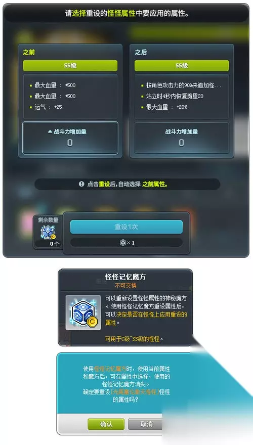 新增怪怪记忆魔方,使用怪怪记忆魔方重设属性后,可以决定是否在怪怪上应用重设的属性。