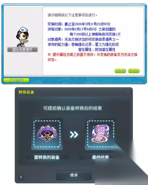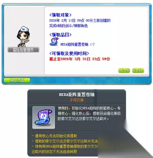 同时,维护前已创建的剑斗/阴阳师,且完成6转的角色,可接取发放[晓之阵]HEXA矩阵重置卷轴任务,获得HEXA矩阵重置卷轴,使用后可初始化HEXA矩阵的技能核心、专精核心、强化核心,提取符合强化等级的索尔艾尔达及索尔艾尔达碎片。