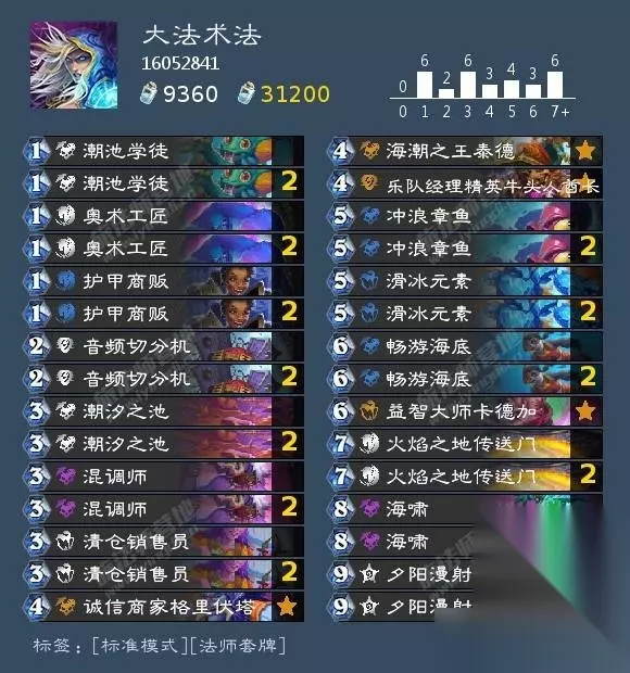 这一套和文章开头的那一套大法术法大致思路相同,不同点在于,舍弃了冲浪章鱼和畅游海底 与大法术之间的联动,转而携带了一些优质低费卡,如巅峰无限和新卡浪潮涌起。目的是为了使得法师能在前期有处理场面的能力。
