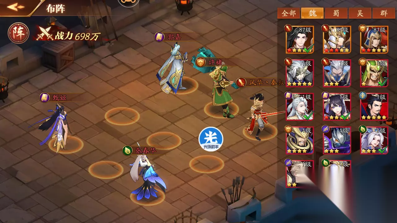 魏国阵容主打一个稳字,前排特别能抗,像乐进、张辽这些武将都是硬骨头,搭配五子良将羁绊还能增加士兵数量,让整个队伍更肉。后排输出主要靠张郃和于禁,一个放毒一个射箭…