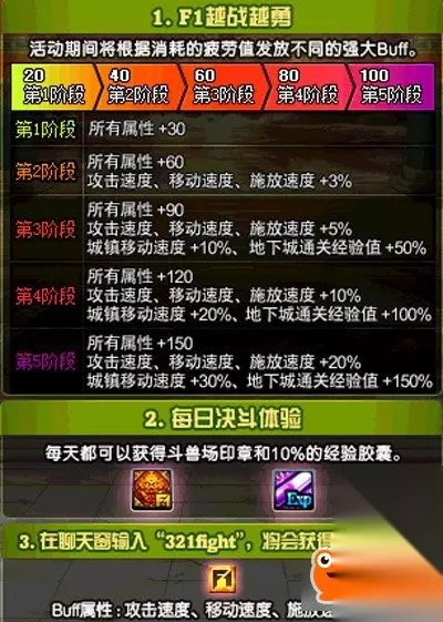 从天王赛预热就开始了,出现了为纪念天王赛的赛事而来鼓励玩家更多的去刷图,怼深渊,爆史诗,给了一个越战越勇的属性加成,都有些什么呢。那可就多了去了,对于玩家角色的疲劳消耗值来进行不同阶段的提升和加成,可谓是给玩家提升了不少刷深渊的动力,许多搬砖角色也能更好的去进行。 在游戏中,玩着玩着就会不知不觉感觉到了角色的提升,当然在最前面是没有多大的改变的,在消耗过疲劳后,就会开始进行提升,不仅是对游戏内,而且也包括游戏外的在城镇中的加成,移动速度上明显的提高了不少,很好的解决了小号没有装备,没有时装的痛苦。 而且更是为了玩家能在PK场进行PK,还特意制定了每日活动,只要参加了决斗场的我那叫爱都可以获得斗兽场印章和一个百分之十的经验药水,可以拿来为小号来助力升级,还能尽可能的都体验一番各种玩法的不同,在PK场里虐大佬想想都是那么的爽。在游戏里不仅能得到疲劳消耗的提升,还可以通过窗口俩天输入“321fight”,还可以获得额外的BUFF加成,真是越来越好,希望这种活动能一直坚持,也能更激起广大玩家的热情。