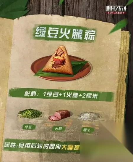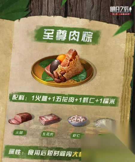 明日之后粽子食谱配方大全 食谱配方介绍 至尊甜粽: 配方介绍:香菇+绿豆+板栗+糯米 至尊肉粽: 配方介绍:虾仁+火腿+五花肉+糯米 绿豆火腿粽: 配方介绍:绿豆+火腿+2糯米