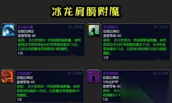 魔兽世界肩膀附魔在哪换 魔兽世界肩膀附魔可以在副本和特定位置以及商人处进行更换。 1、副本 部分战斗副本能够掉落肩膀附魔, 在掉落后就可以直接换取了。