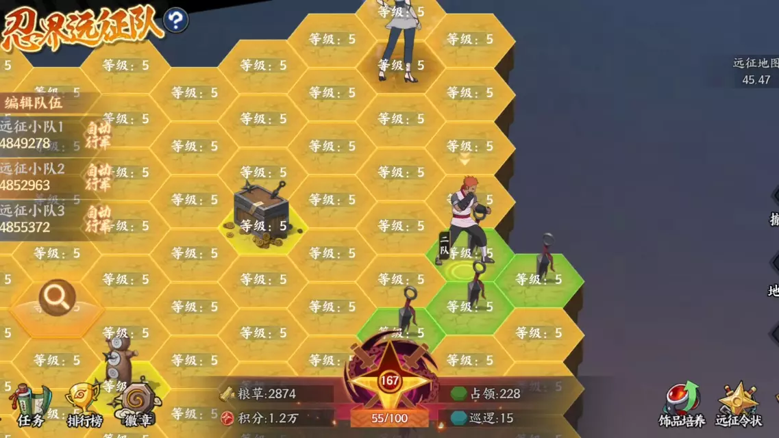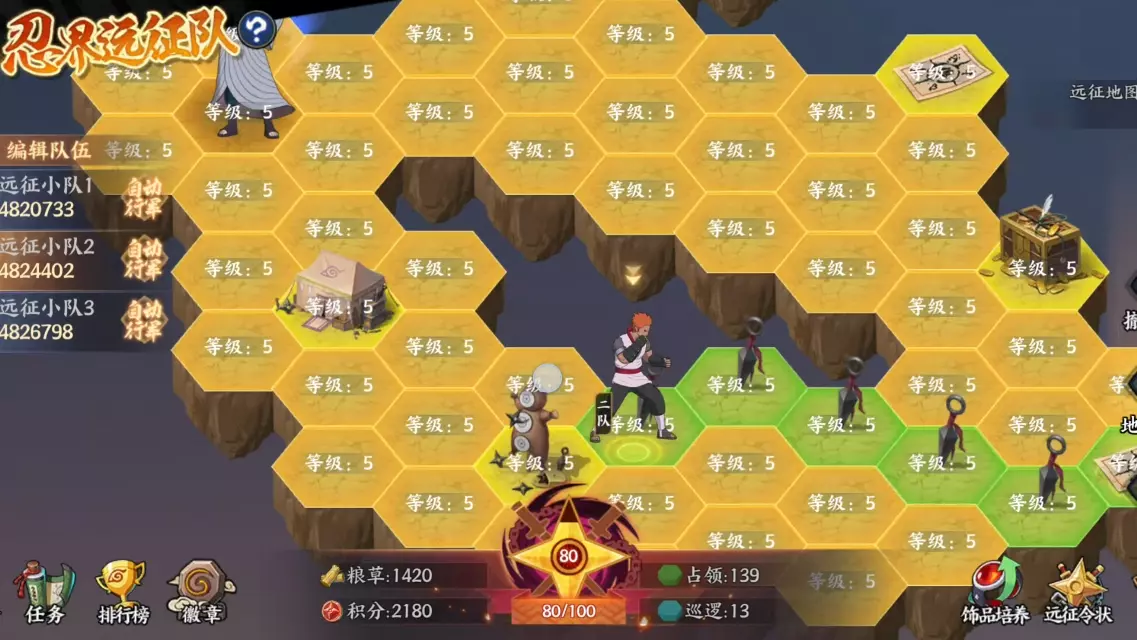 这是忍界远征队尸鬼红唇赛季的通关视频,展示了白嫖路线第二十一天的内容,画面呈现了远征小队的行军、地块占领、战斗挑战及奖励获取等玩法,还有远征地图的探索操作。
