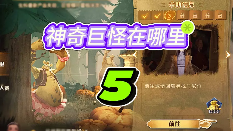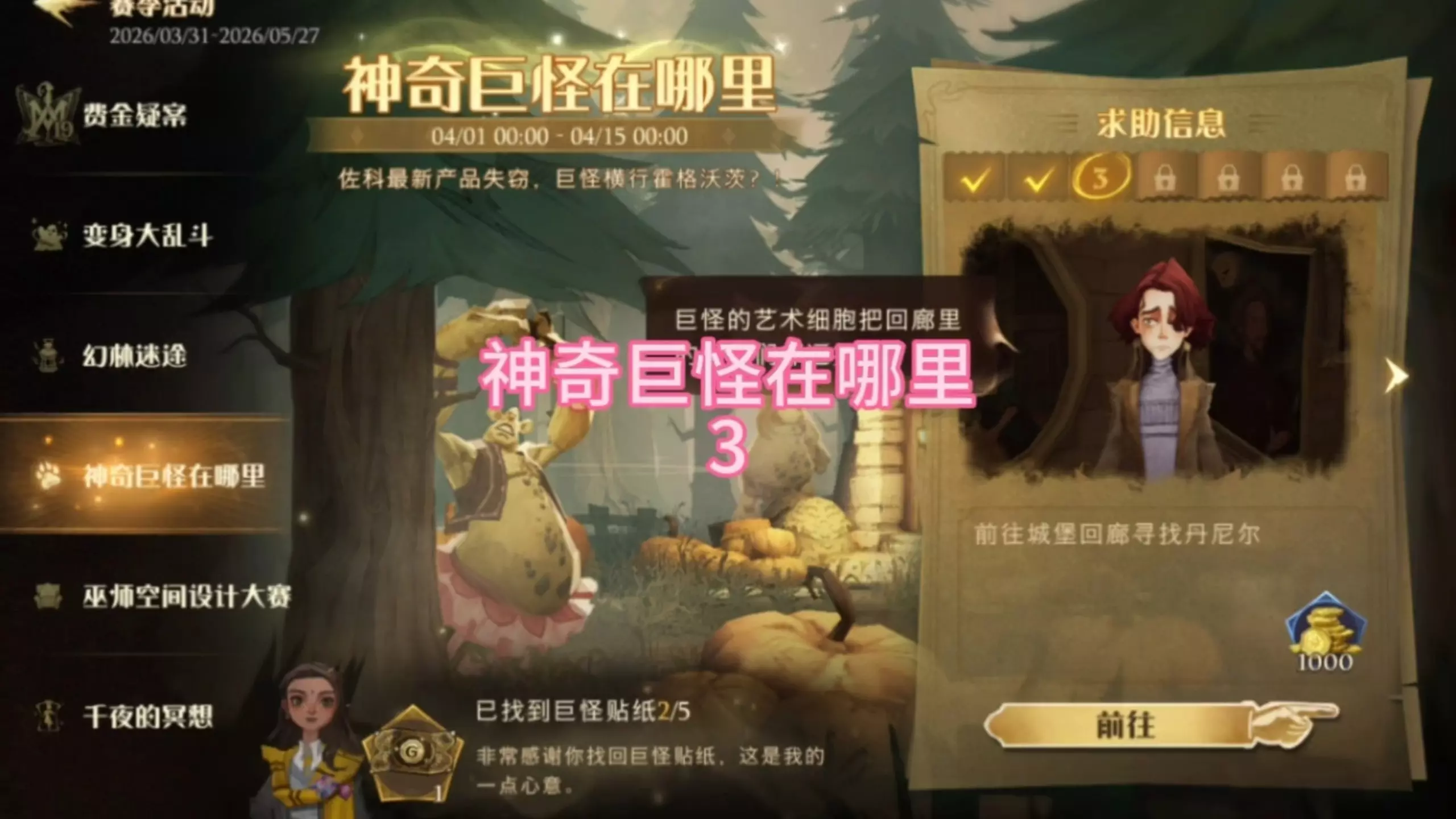 这是《哈利波特魔法觉醒》里“神奇巨怪在哪里5”的任务攻略,活动时间为04/01-04/15,玩家需前往盥洗室找艾薇对话,再和场景泡泡交互,完成任务可获取奖励,当前已找到4张巨怪贴纸。