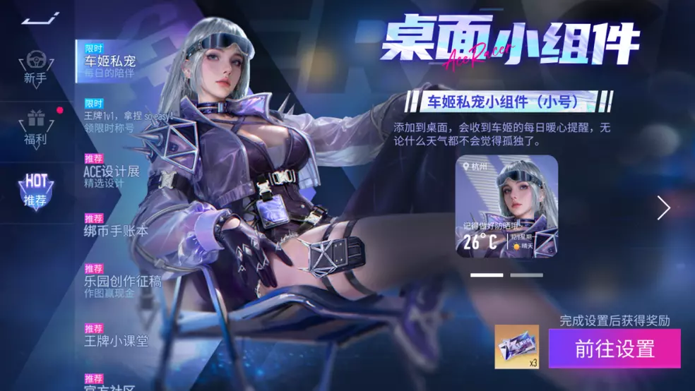 车姬私宠,每日陪伴!1月16日起,王牌车姬桌面小组件来了!各位车手可以添加车姬私宠小组件到手机桌面,可以收到车姬的每日暖心提醒呦~首次设置还将获得:王牌补给券*3(ps:使用小组件需要更新最新的包体,IOS和部分安卓渠道暂不支持,还请各位车手耐心等待一下下)