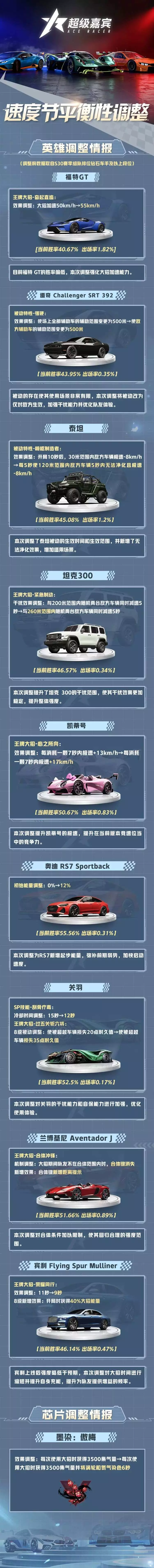 为了维护车辆平衡性生态,带来更好的竞速体验,本次更新带来了部分车辆和芯片的平衡性调整。您可以在游戏内或公众号查看调整详情。