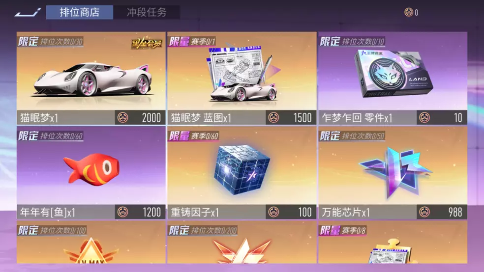 本期排位赛的奖励一如既往的丰厚,除大量的升级材料外,兑换商店还将限时上架车辆:猫眠梦及对应的升级道具,还有全新进阶改装件“年年有鱼”以及稀有兑换道具“重铸因子”。