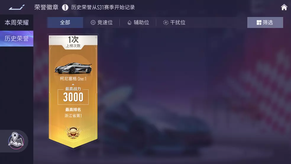 新增【历史荣誉】查看功能,车手们可以查看所获得的最高荣誉徽章。(以结算为准,同时仅记录S31赛季后所获得的徽章)