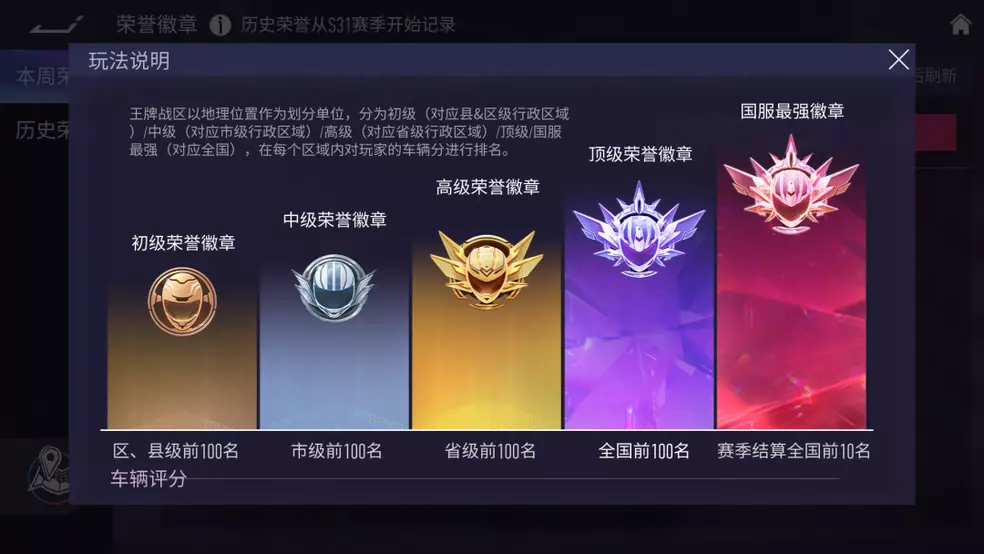 在S31赛季更新后,车辆战力榜单将新增【全国】榜,每周结算时,对应全国前100名的玩家也会获得全新的徽章奖励。(国服最强的结算规则不变)